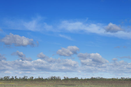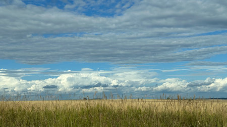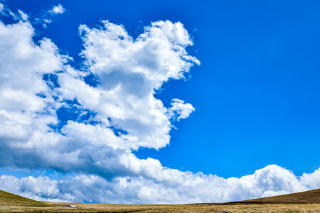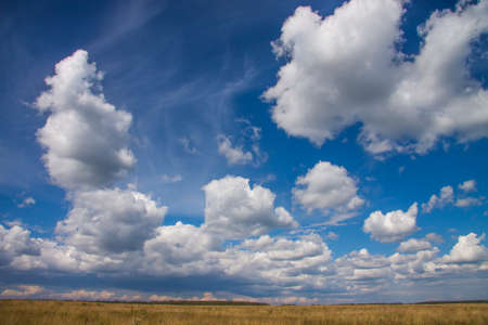 Blue sky with white clouds and grassland. Beautiful natural background.