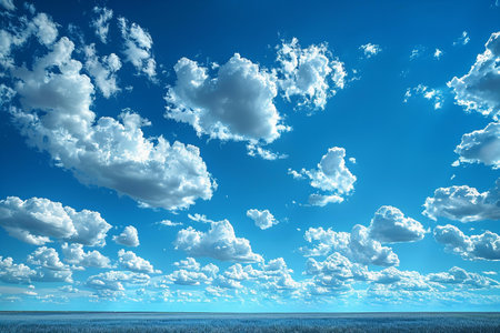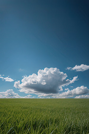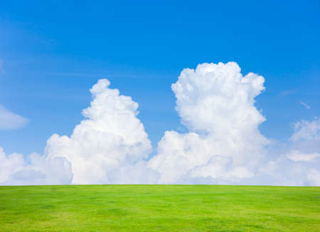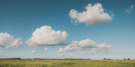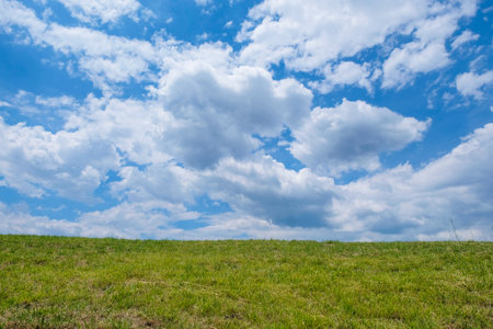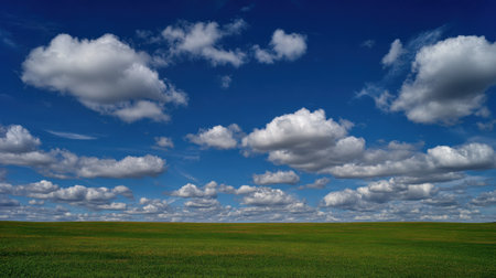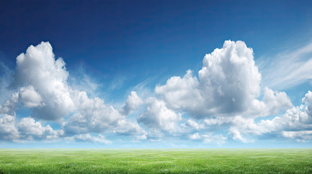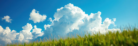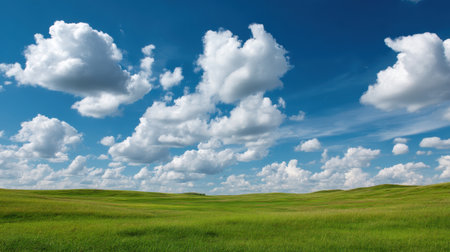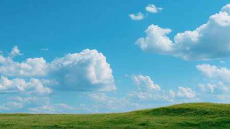 A beautiful landscape showcases a bright blue sky filled with puffy white clouds, contrasting with the vivid green of a grassy field. The composition suggests an open outdoor environment, with soft lighting enhancing the natural tones. This image is suitable for various commercial uses, including background imagery and design elements.