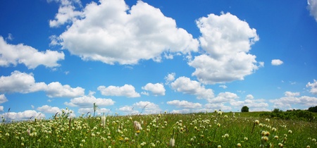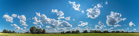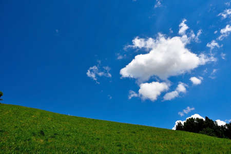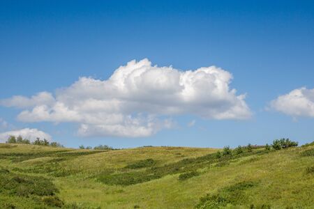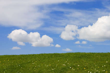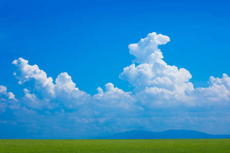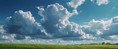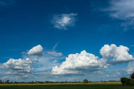 Beautiful clouds over green grass under a bright blue sky on a sunny day