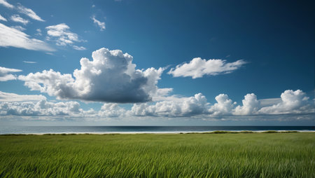 A breathtaking view of a lush green field meets a vivid blue sky filled with fluffy white clouds, creating a serene and inviting atmosphere perfect for nature lovers.