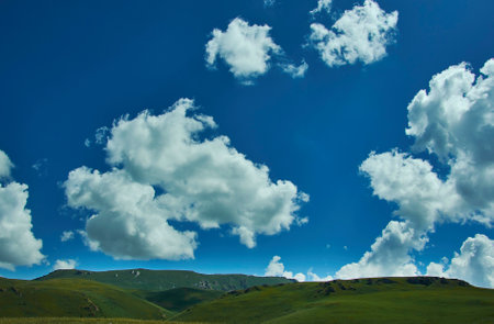 Expansive green hills stretch towards a bright blue sky adorned with fluffy white clouds. This serene landscape captures the essence of nature's beauty and tranquility.