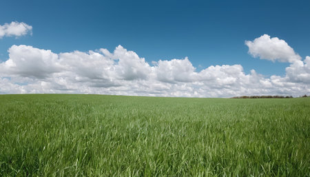 A scenic panoramic view of a vibrant green field stretching to the horizon under a brilliant blue sky with scattered white cumulus clouds and a bright sun.