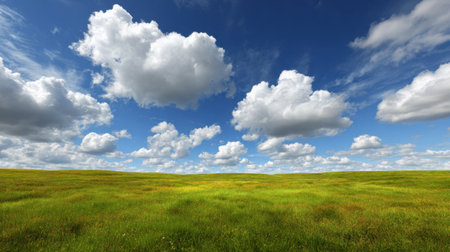 A stunning view of a lush green grassland under a bright blue sky adorned with fluffy white clouds creates a serene nature landscape perfect for relaxation.