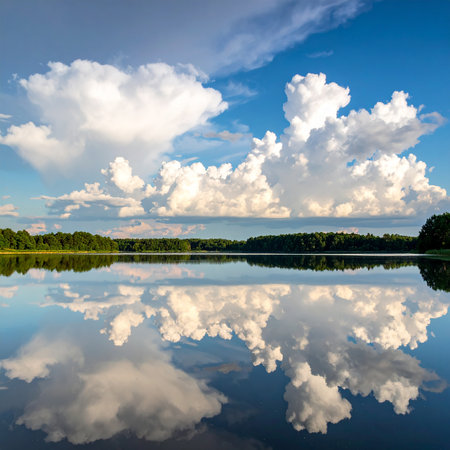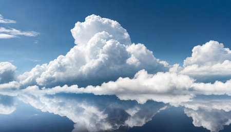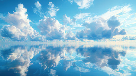 Stunning view of fluffy clouds reflected on a serene water surface, showcasing a bright blue sky and a sense of tranquility and peace in nature.
