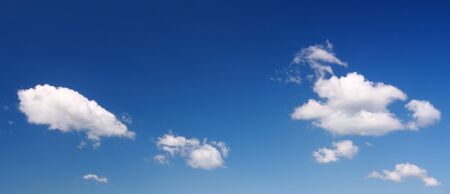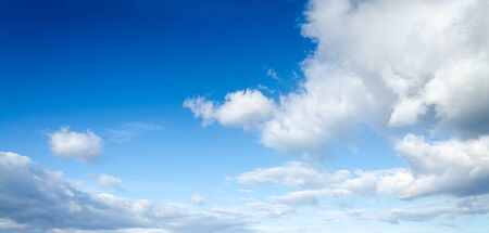 Banner Tropical summer blue sky fluffy white cloud summertime on light sunny day cloudscape. Panoramic Clear bright blue skyline spring sunlight climate background. Heaven blue ecology for web banner