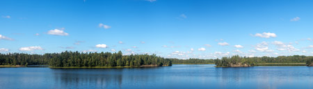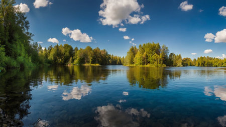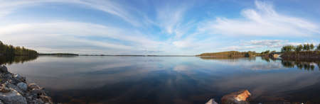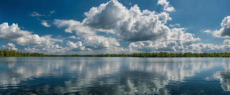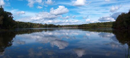 Panoramic view of the forest lake with reflection of clouds in water