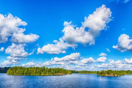 landscape with clouds and islands on a forest lake in summer