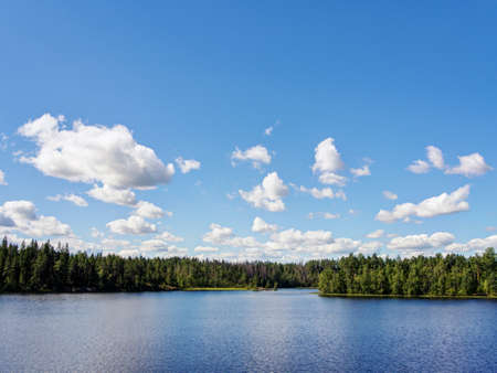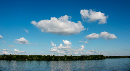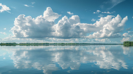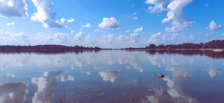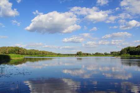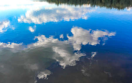Summer cloudy landscape against the blue sky and its reflection in the water. White clouds in the sky above the surface of the bay in the lake.
