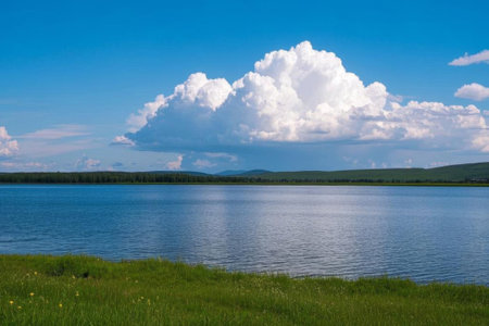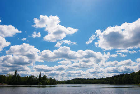 Cumulus clouds on a lake in summer