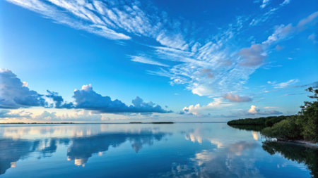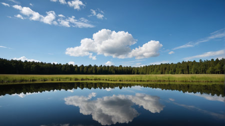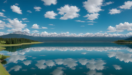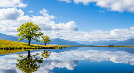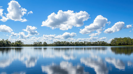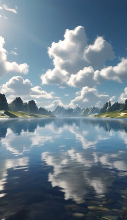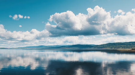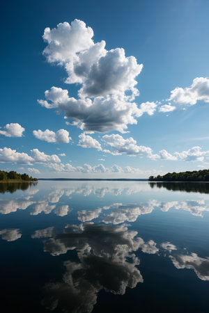 reflections of the sky and clouds on a calm lake, created with generative ai