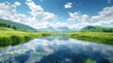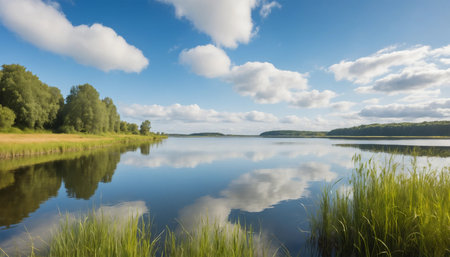 A stunning view of a tranquil lake reflects the vibrant blue sky and fluffy clouds. Surrounded by lush greenery and gentle hills, this serene landscape invites relaxation.