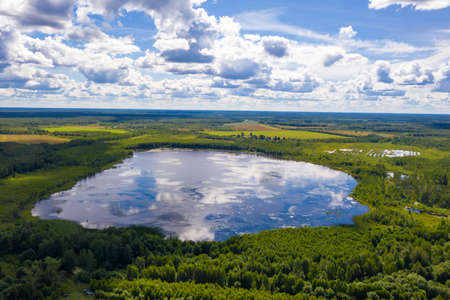 A small lake surrounded by a green forest near the village of Bunkovo, Ivanovo District, Ivanovo Region, Russia. Photo taken from a drone.