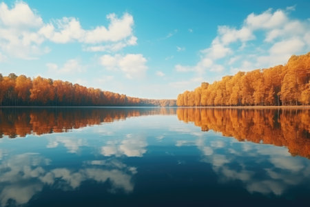 Autumn tranquil lake with beautiful Fall foliage and blue sky. Autumn seasonal concept. AI generated.