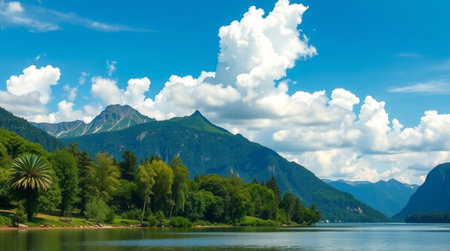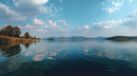 serene lake reflections with cloud-filled sky and blue waters, created with generative ai