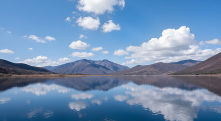 Captivating view of a tranquil lake reflecting stunning clouds and mountains, illuminated by bright sunlight. Perfect for nature lovers and outdoor enthusiasts.