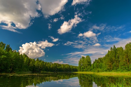 Beautiful summer landscape with lake, forest and clouds reflected in water