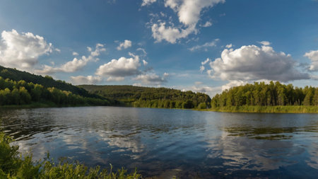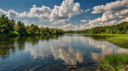Beautiful summer landscape with lake, forest and blue sky with clouds ai generated.“This image was created using generative artificial intelligence tools
