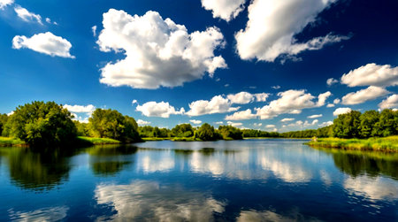 beautiful summer landscape with river and blue sky with clouds reflected in water