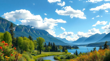 A beautiful landscape with a river running through it. The sky is clear and blue, and the sun is shining brightly. The water is calm and still, reflecting the surrounding trees and mountains