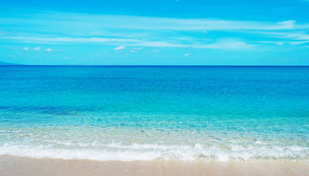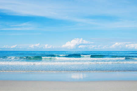 Tropical sea waves surf coming on beach, blue sky over horizon