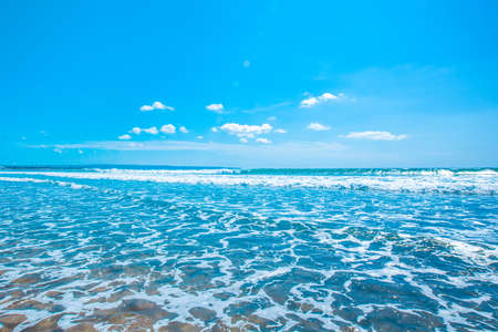 Seascape, sea view. Waves at sea, sea tide, sandy shore. Sea foam. Beautiful clouds in the blue sky. Traveling in Asia.