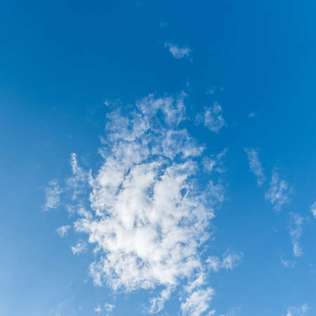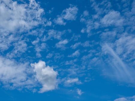 White cumulus clouds in a blue sky. Backgrounds with a pattern of high-beam clouds. Weather, seasonality, ecology, clear sky. Peace