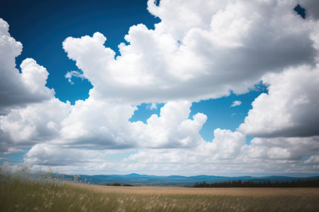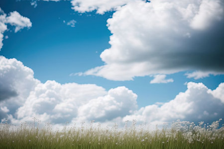 Summer scene with beautiful white clouds in blue sky over the meadow with lush grasses