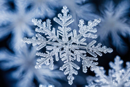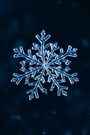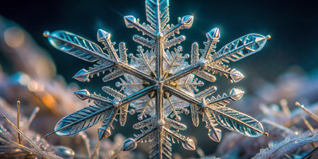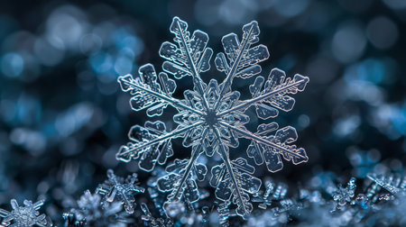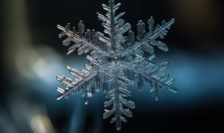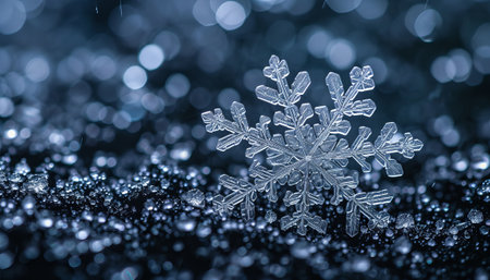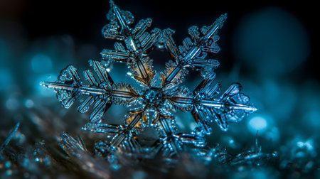 Capture the beauty of an intricate snowflake against a dark background. This macro image highlights the delicate details and unique patterns inherent in nature during wintertime.