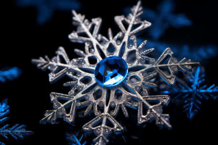 AI Generated. Close-up of an elegant snowflake-shaped brooch amid icy blue tones