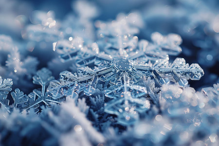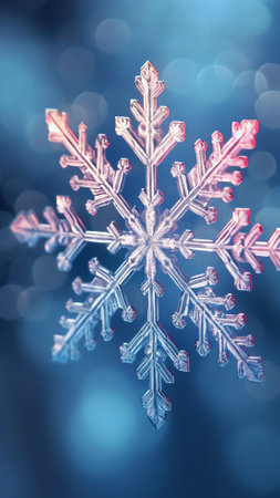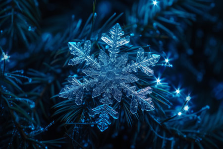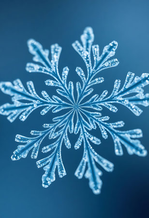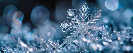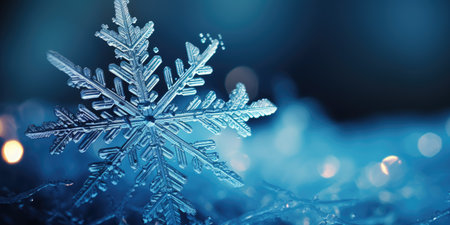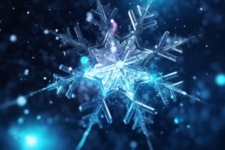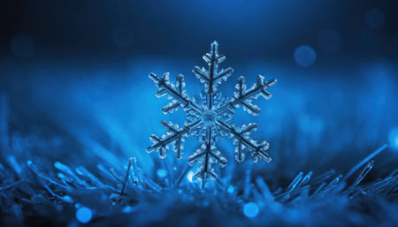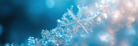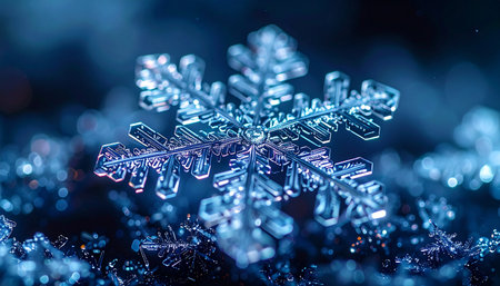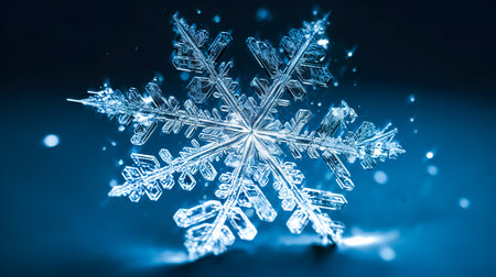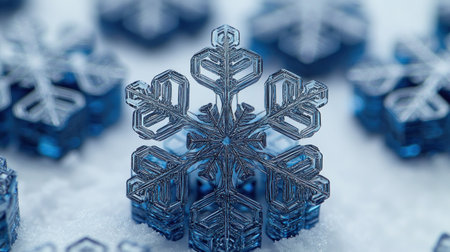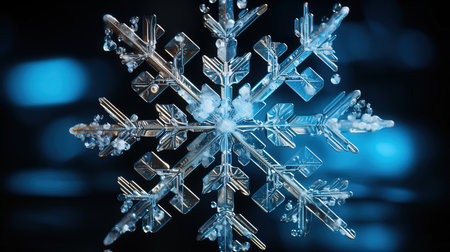 close-up of a delicate snowflake, sparkling in cool blue light with intricate crystal details