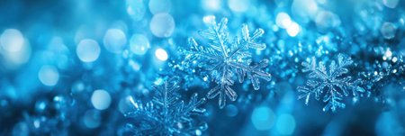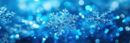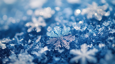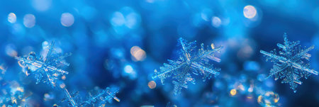Intricate snowflakes glisten in a rich blue ambiance, showcasing their unique patterns and enhancing the magical winter atmosphere.