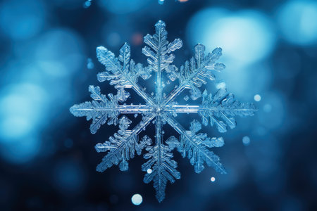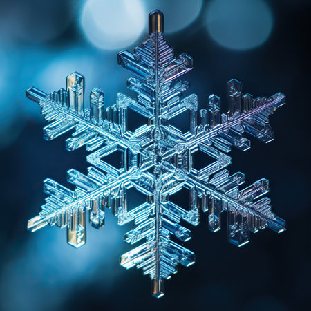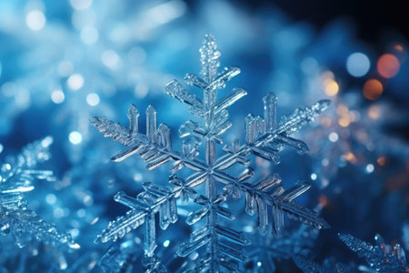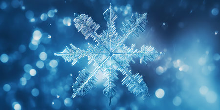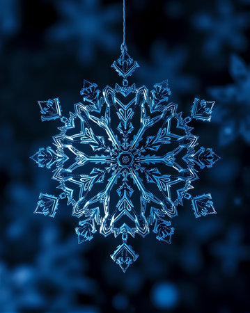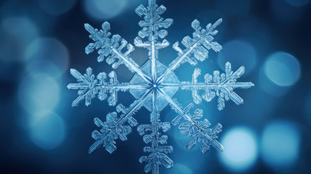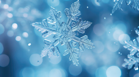 A captivating image of a clear ice snowflake set against a shimmering blue background with a bokeh effect, ideal for winter-themed projects.