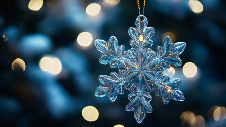 A detailed crystal snowflake ornament hangs from a tree branch, illuminated by soft bokeh lights in a festive atmosphere.