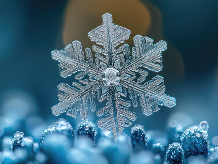 A macro shot of a single delicate snowflake, perfectly crystalline in its intricate structure