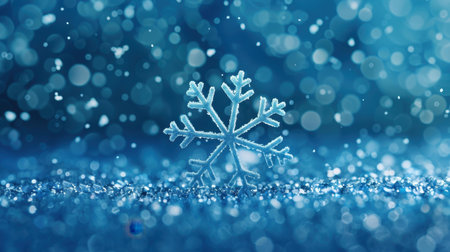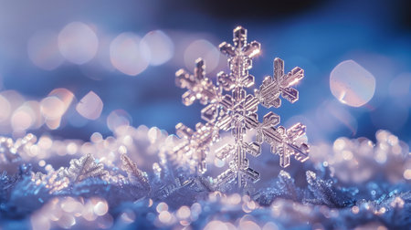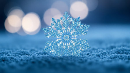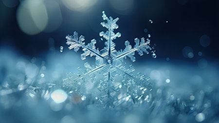 Close up of a delicate snowflake resting on soft snow with a dreamy blue bokeh background Magical winter ambiance evokes tranquility and beauty