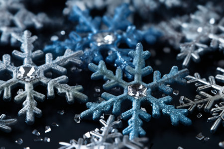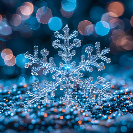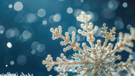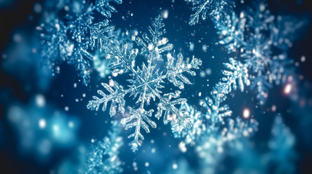Stunning image featuring intricately designed snowflakes resting on a deep blue surface, accentuated by shimmering bokeh lights, ideal for winter-themed projects.