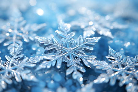 Generative AI : Snowflakes macro closeup in the winter outdoors Blue background snow texture brilliant sparkling bokeh