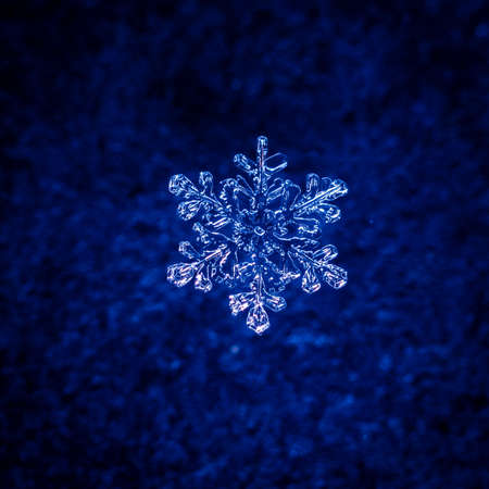 Snowflake on a dark blue background. Macro photo with shallow depth of field.