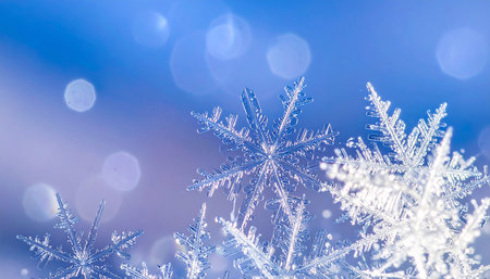 Close-up view of beautiful snowflakes resting on a soft blue background, showcasing intricate details and a serene winter atmosphere. Ideal for seasonal themes.