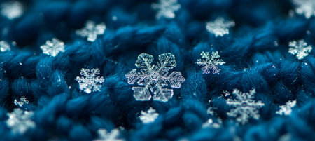 Close-Up of Intricate Snowflakes on a Cozy Blue Knitted Fabric, Capturing Winter s Elegant Beauty