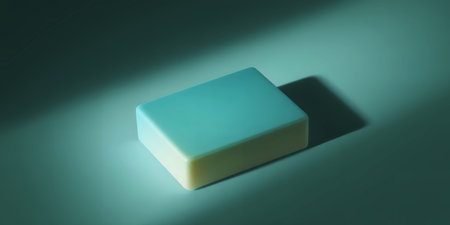 A teal and yellow rectangular object rests on a teal surface with soft light. Clear details and vi...