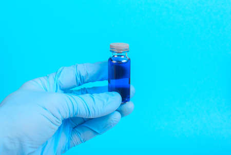 vial with a vaccine or cure for holding a blue gloves on a blue background