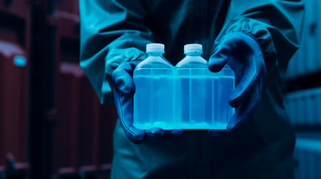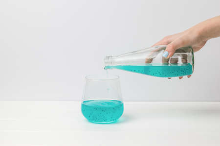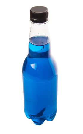 A person is holding a blue liquid bottle in their hand, potentially containing a solution or drink, made of glass or plastic, in varying tints and shades