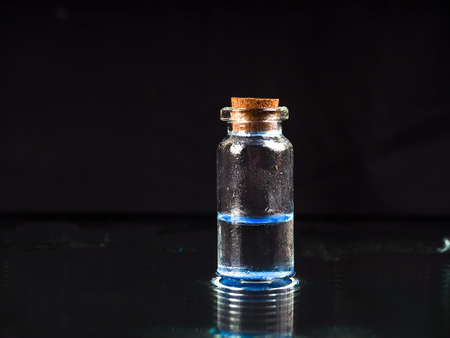 one bottle with a blue liquid and a cork on a black background, next to raindrops. Space for text. Medical research, refreshing cosmetics.
