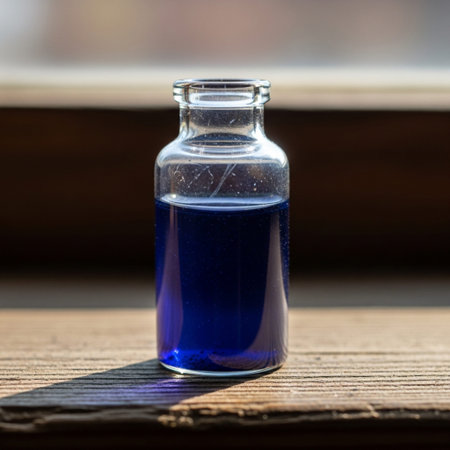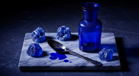 A still life composition featuring rough cobalt blue crystals, a small blue glass bottle, and a spoon with spilled blue liquid on a marble surface.