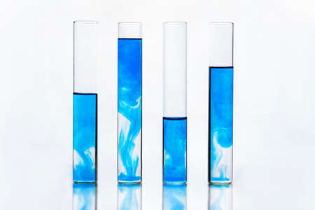Glass test tubes or flasks with blue liquid on white background for scientific analysis. laboratory research and development concept. scientist sample chemistry or medicine test