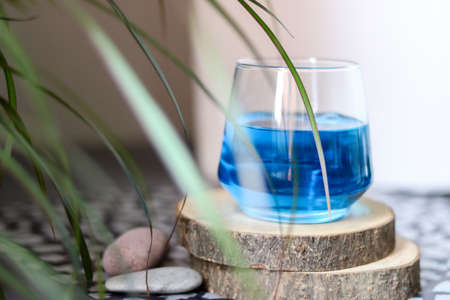 Blue liquor in glass, standing on wooden stand, decorated with stones