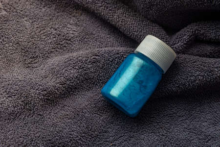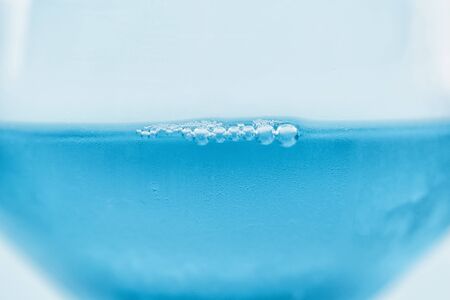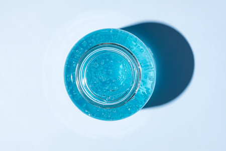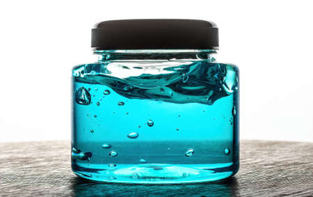 blue bubble skin care cream gel in a glass jar top view. Beauty treatment product texture macro. Top view