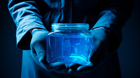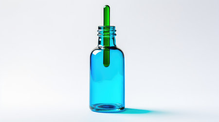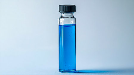 A sleek, transparent glass container showing vibrant blue serum against a soft, neutral backdrop, ideal for medical or scientific themes.