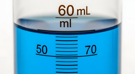 A close-up macro shot of a scientific glass beaker with measurement markings. A blue liquid is inside, with the bottom of the meniscus accurately measuring 60 milliliters (ml). The image represents precision, chemistry, and laboratory work.